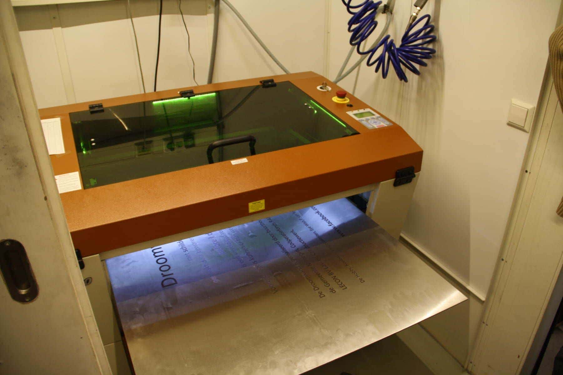 Leendertz vervolgt: “Roestvrijstaal op deze manier met een fiberlaser bewerken, is toch wel bijzonder te noemen. De machine draait nu een half jaar en op unieke wijze houdt Gravure’85 zich bezig met grootformaat metalen markeren. Een fiberlaser machine is veel efficiënter qua energie vergeleken met een YAG laser. Tegenwoordig kunnen fibers met verschillende frequenties werken op uiteenlopende materialen, ook plastics. Met name in de automotive industrie wordt gewerkt met fiber, deze techniek wordt hier zelfs een concurrent van zeefdruk. Nog een voordeel is dat je kunt variëren tussen diep zwart en verschillende kleurschakeringen door de frequentie/wave vorm combinatie te veranderen. En met de fiberlaser onstaat geen ruwheid, waardoor de markering voldoet aan HACCP normen.” Gravure’85 heeft dagelijks een goed gevulde machine draaien, waarmee – niet onbelangrijk – met de reeds in het bedrijf toegepaste software wordt gewerkt.